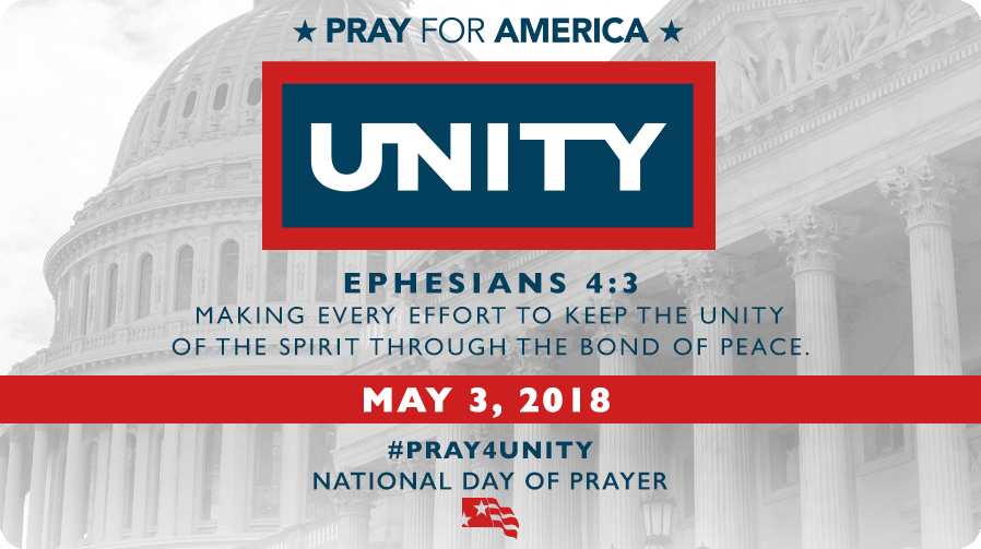 Prayer brings people together. Prayer builds bridges between opposing persons and even political parties. Prayer reminds us that we are created in God’s image and He desires for us to represent Him everywhere we go. Prayer brings UNITY. In 2018, our theme will be Pray for America – UNITY, based upon Ephesians 4:3 which challenges us to mobilize unified public prayer for America, “Making every effort to keep the unity of the Spirit through the bond of peace.”