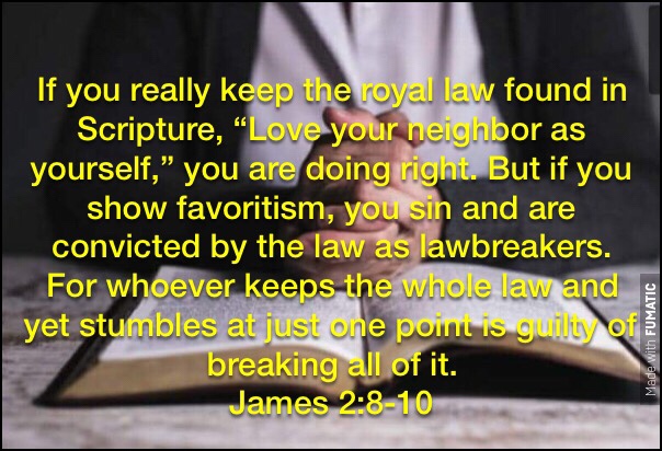If you really keep the royal law found in Scripture, “Love your neighbor as yourself,” you are doing right. But if you show favoritism, you sin and are convicted by the law as lawbreakers. For whoever keeps the whole law and yet stumbles at just one point is guilty of breaking all of it.